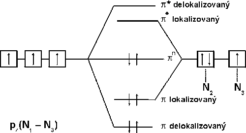 Tři atomy dusíku v jeho molekule jsou uspořádány lineárně, popis vazebných poměrů je složitý, protože se uplatňuje jedna lokalizovaná π-vazba i delokalizovaný π-systém.